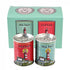 A pair of metal tin salt and pepper shakers with retro style Cornish sea salt and Seaweed pepper branding, featuring a lighthouse and seaweeds.