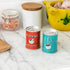 A pair of metal tin salt and pepper shakers with retro style French salt and pepper (Sel and Poivre) branding.
